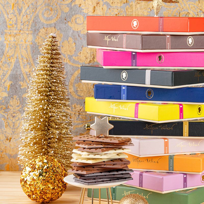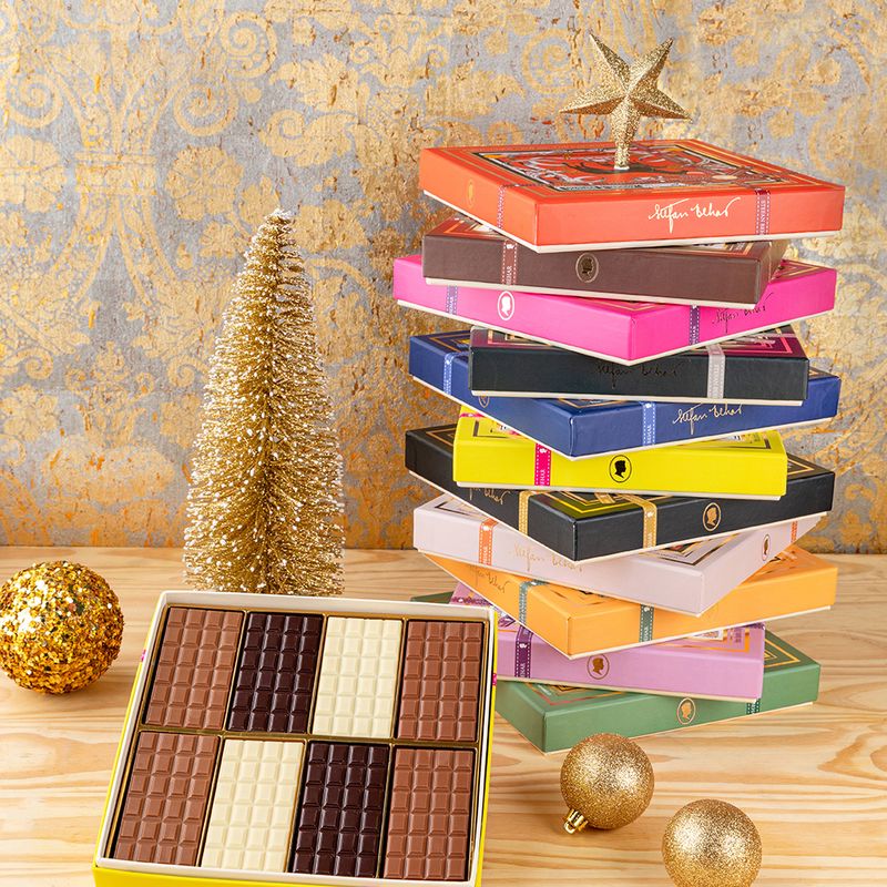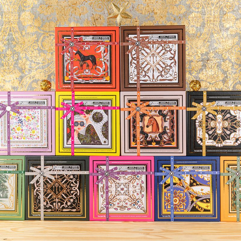 Dentro, uma deliciosa degustação de finíssimas barrinhas de chocolate, sendo: