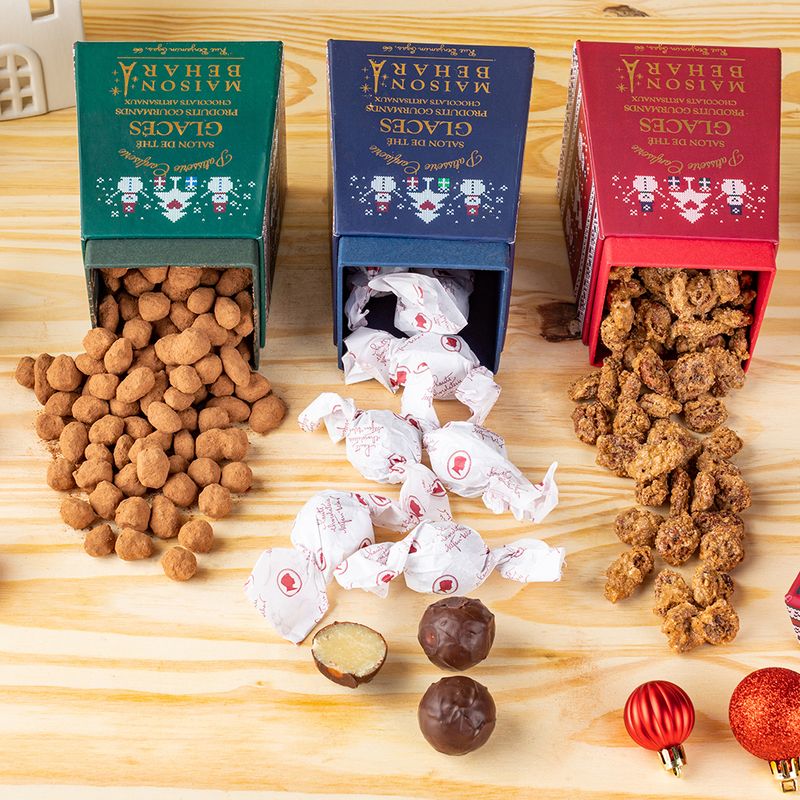 Givrettes - Amêndoas e avelãs caramelizadas e finalizadas com cacau em pó ou açúcar de confeiteiro.