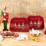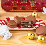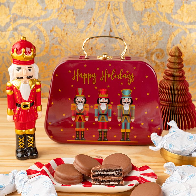 Uma lata charmosa em formato de maletinha, estampada com soldadinhos de Natal, guarda um tesouro irresistível: biscoitos Oreo banhados no nosso chocolate.